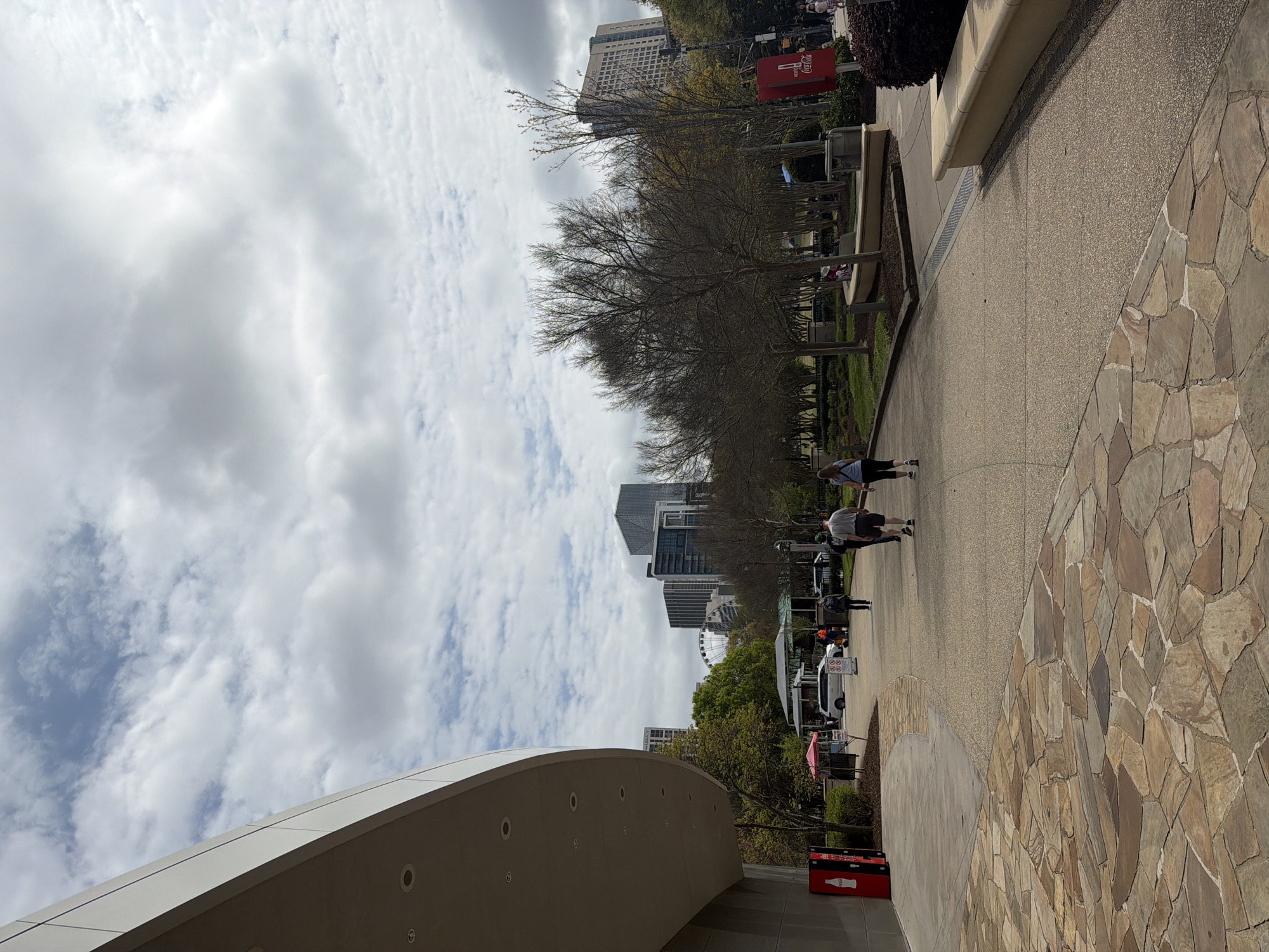 The image depicts a sidewalk scene in Centennial Olympic Park, Atlanta, Georgia, United States of America. Several people are walking along the sidewalk. A Coca-Cola machine is visible near the lower right corner. In the background, there are trees, buildings, and the Ferris wheel. The sky is cloudy.