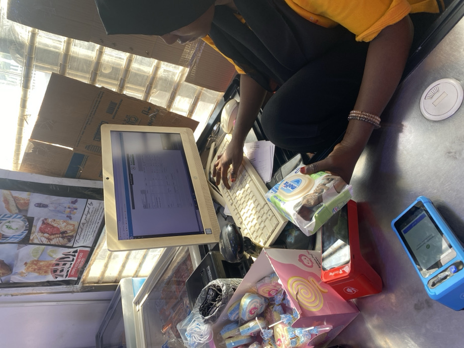 An indoor scene in a retail establishment in Kabala, Nigeria, depicts a female individual with dark skin, wearing a black head covering and a yellow garment, seated at a counter. Her right hand is positioned over a beige keyboard, while her left hand holds a package of "Molfix" baby wipes. Multiple light-colored bracelets are visible on her left wrist. An HP monitor displays a "Malfi Invoice" interface. On the metallic counter surface, a pink box containing individually wrapped "Bubble Pop" lollipops is present. Adjacent to this is a black barcode scanner, a red payment terminal labeled "PayPoint" with a smartphone attached, and a blue payment terminal displaying an active transaction screen. A white circular disc lies near the blue terminal. A stack of white papers rests beside the keyboard. In the background to the left, the top of a glass-door commercial freezer is visible. The wall behind the freezer features posters advertising "ZERDA EXOTIC FOOD PARLOUR" with images of various food items. Behind the seated individual, sunlight penetrates through a window with horizontal grates, partially obscured by large cardboard boxes.