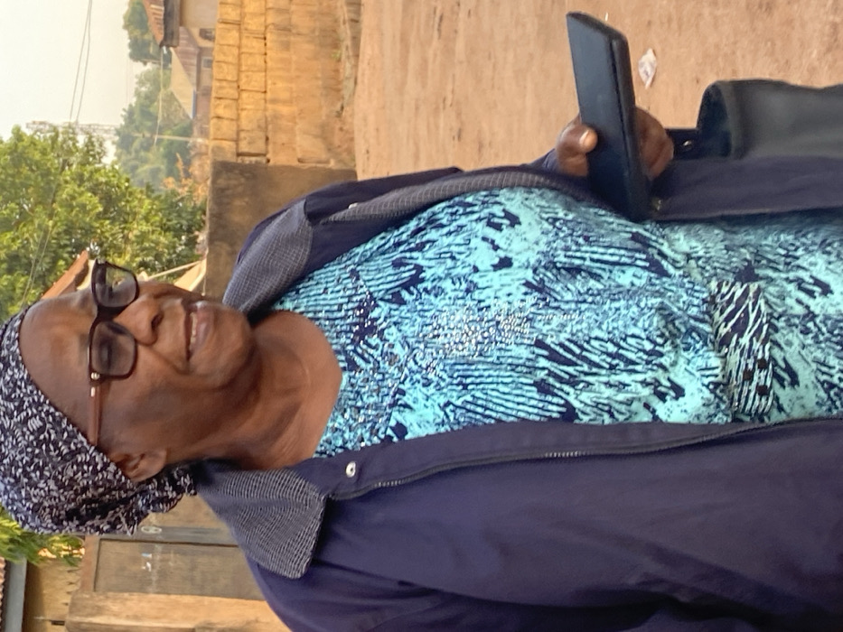 An elderly woman with glasses and a patterned headscarf holds a black smartphone, facing left with a slight smile. She wears a turquoise and blue patterned top under a navy jacket. A black shoulder bag rests beside her. The background shows a rustic outdoor setting with buildings and greenery under a bright sky. The photograph is taken at an angle, making the subject appear sideways.