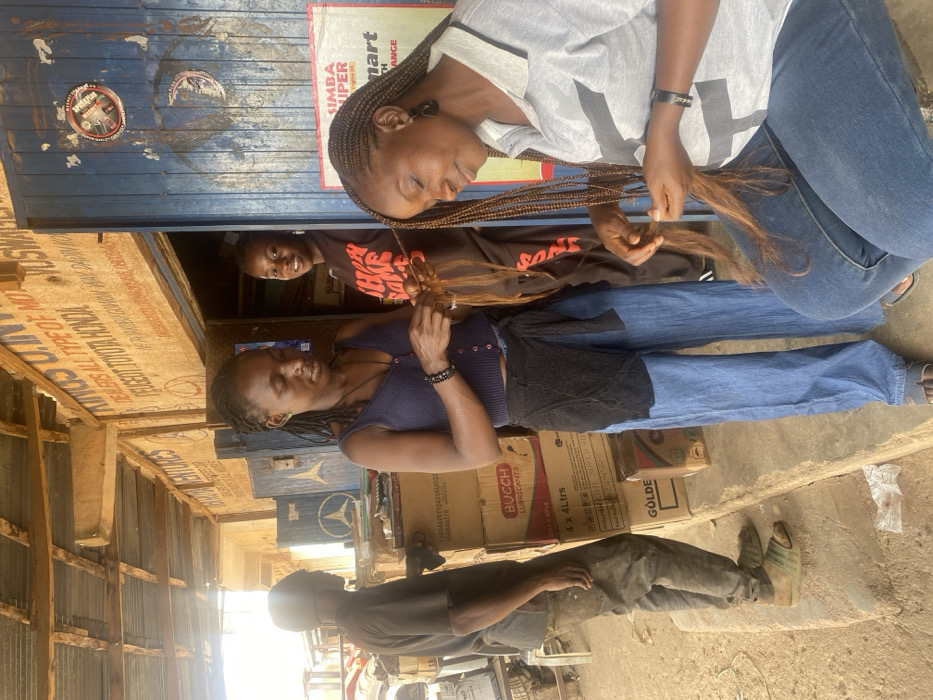 - "Two women braid each other's hair outside a shop, with a young woman watching from inside" by FM-8pMv02, licensed under CC BY 4.0