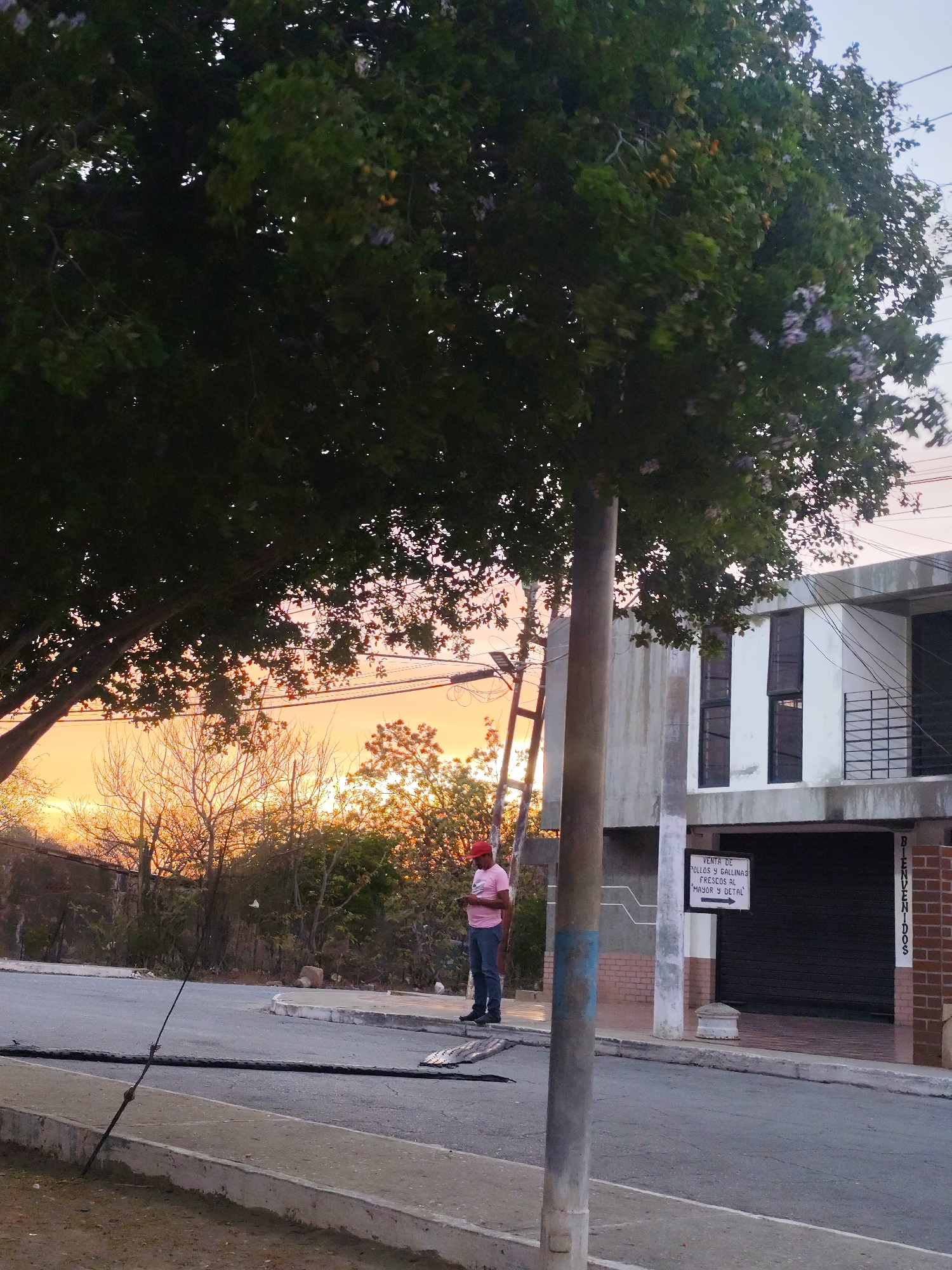 This image depicts an urban scene at dusk or dawn in Las Hernández, Venezuela, characterized by an orange and pink sky. In the foreground, a concrete curb separates a dirt patch from a paved road where a thick, dark, braided cable lies on the asphalt and extends onto the sidewalk. A thin metal rod is partially visible, angled from the lower left towards the cable. A male individual stands on the sidewalk to the right of the cable, wearing a red baseball cap, a light pink short-sleeved shirt, and dark blue jeans. He is looking down, engaged with a white smartphone held in his hands. Directly behind him and slightly to his left is a light-colored concrete utility pole with blue markings. To the left, a large tree with dense green foliage, interspersed with some purple flowers, dominates the upper frame, partially obscuring the sky. Further back on the left, bare trees and green shrubs are silhouetted against the bright sky. A tall, A-frame ladder is visible in the background, standing upright or leaning, illuminated by the low sun. On the right side of the frame, a two-story building is visible. The upper floor features a modern design with white and gray sections, dark-framed windows, and a balcony with dark metal railings. The ground floor has a dark, closed roller shutter. A white rectangular sign with black text, "VENTA DE POLLOS Y GALLINAS FRESCOS AL MAYOR Y DETAL" (Sale of fresh chickens and hens wholesale and retail) and an arrow pointing right, is affixed near the ground floor. A brick column on the far right displays "BIENVENIDOS" vertically. Multiple utility lines traverse the upper midground against the colored sky.