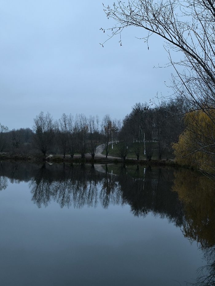 The image depicts a tranquil outdoor scene in Parkhomivka, Ukraine, dominated by a still body of water under an overcast sky, likely during late autumn or early winter. The upper third of the frame shows a pale blue-grey, uniformly overcast sky. The lower two-thirds are occupied by a dark, reflective body of water, possibly a pond or lake, mirroring the sky and the trees on the opposing bank. On the far bank, a discernible shoreline runs horizontally across the midground. A line of approximately ten deciduous trees with bare, dark branches stands along this bank. Behind these trees, a light-colored dirt or gravel path curves gently from the left mid-frame, ascending towards the right. Further up a gentle incline behind the path, additional clusters of bare deciduous trees are visible, along with several slender, vertical white elements, possibly posts or markers, interspersed among the trees. To the far right on the bank, a tree with distinctive yellowish-orange foliage stands out against the darker, bare trees. In the upper right quadrant of the image, a portion of a tree's bare branches, dark in color and extending downwards and leftwards, partially intrudes into the frame. These branches bear numerous small, dark, elongated structures, consistent with catkins. There are no individuals, animals, or active subjects present in the scene, and no specific actions or interactions are depicted. The overall environment appears natural and undisturbed, characterized by muted tones and the stillness of the water.