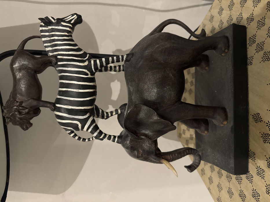 An indoor photograph depicts a decorative statuette of three stacked animal figurines, located in Le Puy-en-Velay, France. The central subject is a dark grey-brown elephant figurine, positioned facing left with its trunk curved downwards and two prominent off-white tusks. It stands on a dark, rectangular base. Balanced on the elephant's back is a black and white striped zebra figurine, oriented towards the right. At the apex of the stack, a dark grey-brown lion figurine, with a discernible mane, stands atop the zebra, facing left. The entire statuette rests on a light-colored surface patterned with repeating dark, stylized star-like motifs. The background is an unadorned, light beige wall. A thin black electrical cord is partially visible behind the right side of the elephant figurine, indicating a potential electrical connection or lamp component. The scene is illuminated by ambient light from above. No people are present.