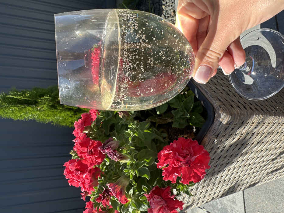 A close-up, eye-level photograph captures a right hand holding a stemmed glass filled with a sparkling, light-yellow liquid on a sunny day in Shevchenkove, Ukraine. The hand exhibits light skin tone and nails with a French manicure, gripping the stem of the clear glass which contains numerous small effervescent bubbles. To the left and slightly behind the glass, a rectangular, light-brown wicker-style planter holds a vibrant arrangement of red double-petunia flowers and green foliage; some blossoms are fully open, while others show signs of wilting. Further in the background, a slender, dark green coniferous shrub stands before a dark, vertically corrugated fence or wall. The foreground features light grey paving stones or tiles. Direct sunlight illuminates the scene, creating highlights on the glass and reflections on the dark background.