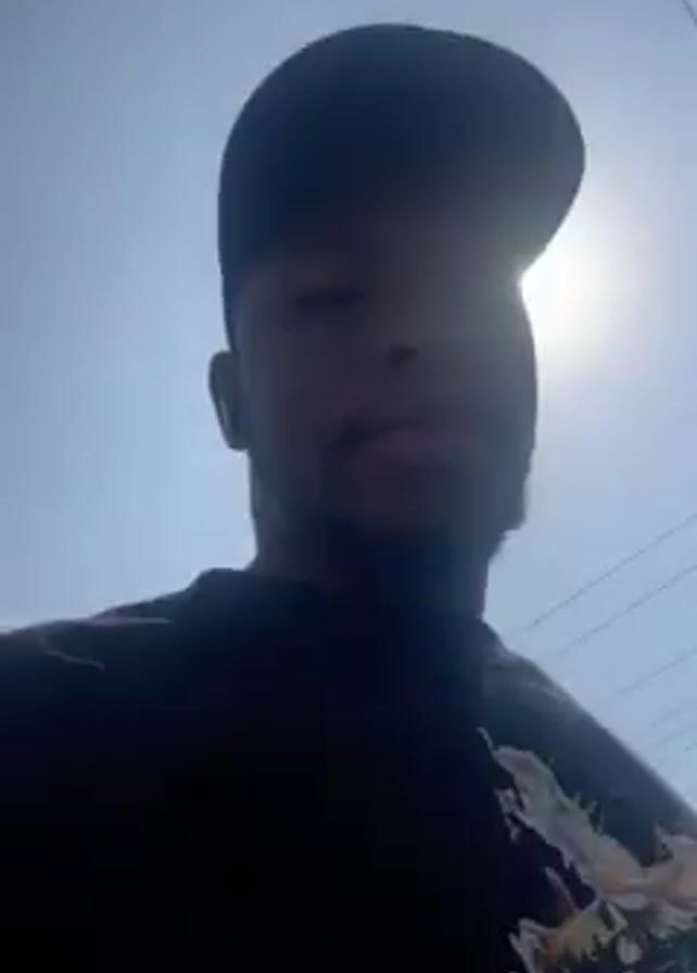 Here is a detailed description of the video: The video shows a person with brown skin, wearing a black t-shirt with a colorful design and a black baseball cap. The person is standing outdoors with a clear blue sky and power lines visible in the background. The sun is very bright, making it difficult to see the person's features clearly. At one point, the person makes a peace sign. Sounds of traffic noise can be heard.