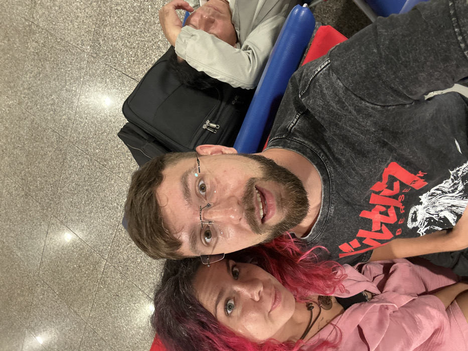 A selfie shows a bearded man in glasses and a "Berserk" t-shirt lying on a floor with a woman with pink hair, who is wearing a pink blouse and necklace. Behind them is a person lying down, partially obscured, along with a black suitcase and blue cushion. The floor is made of light grey tiles. The man's expression is surprised, and the woman's is more neutral.
