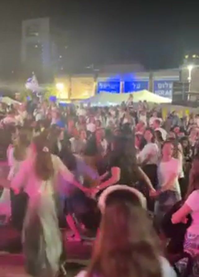 A crowd of people is dancing in a circle outdoors at night. Many hold hands, and the atmosphere appears festive. In the background, there are structures with signs in what appears to be Hebrew, and some Israeli flags are visible. The lighting is a mix of street lights and event-specific lighting. There are buildings in the background.