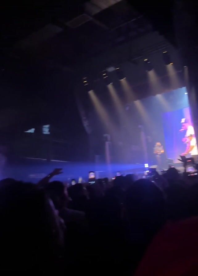 The video captures a live musical performance on a brightly lit stage, viewed from a crowd of people. Stage lighting in blue and purple hues illuminate the performing artists, and a large screen in the background displays visual elements. The crowd is visible in silhouette, many holding up their phones to record the performance.