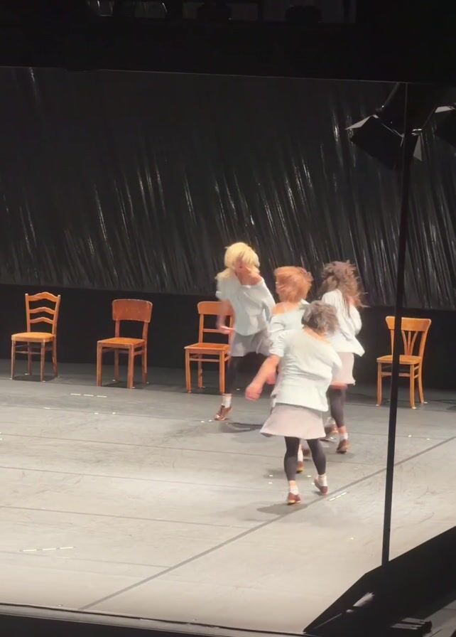 A stage performance is taking place. Four young women, dressed in similar light-colored shirts, grey skirts, black leggings, and brown shoes, are performing a dance routine on a stage. The stage has a glossy grey floor, and a dark backdrop with vertical crinkled patterns. Five wooden chairs are placed in a horizontal line towards the back of the stage. The women perform movements including bending over, shaking their hair, and walking/running. An audience is visible in the foreground, below the stage. Stage lighting is visible from the sides and above. The camera is stationary.