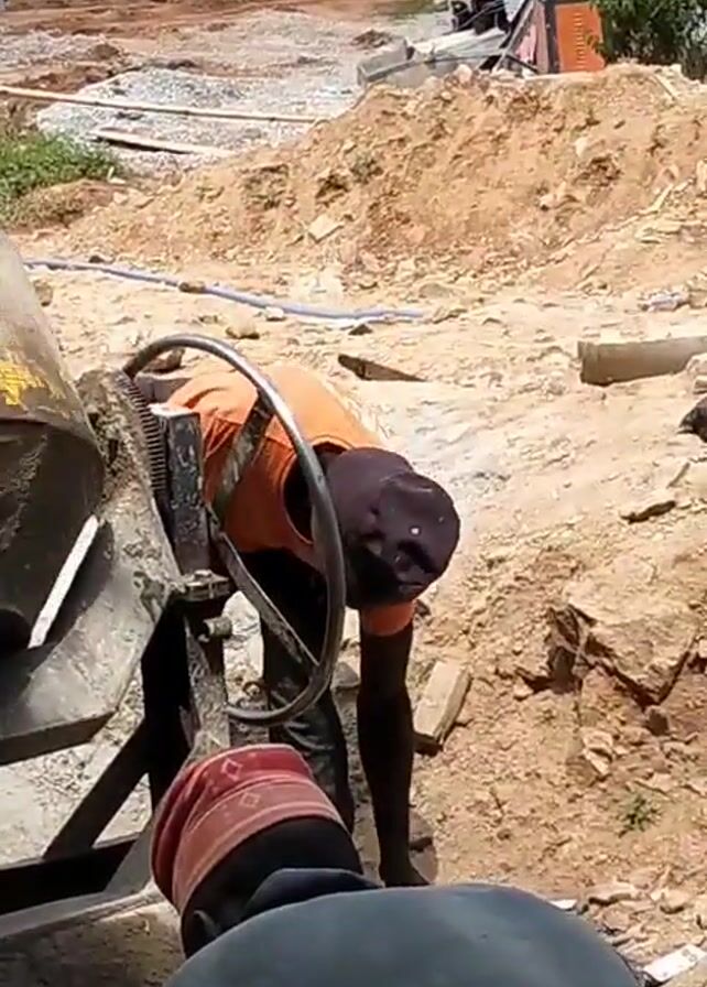 The scene takes place at a construction site, where two construction workers are operating a cement mixer