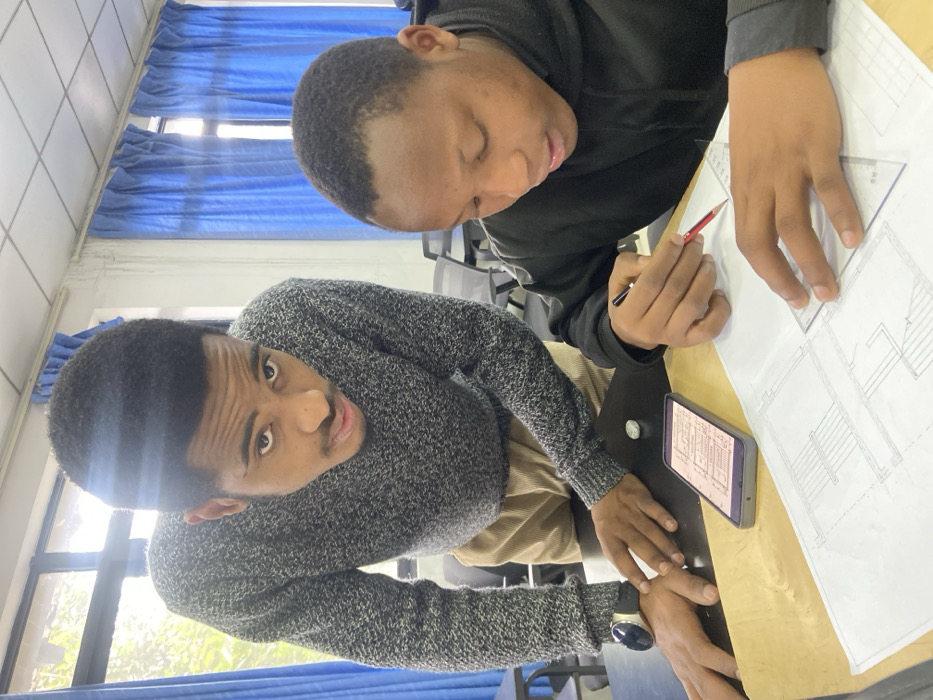 Two young men are working together on what appears to be architectural plans. One man, in a gray sweater, looks directly at the camera. The other, wearing a black shirt, is focused on the plans, holding a pencil and ruler. A smartphone displays a similar architectural drawing. They are seated at a desk with blue curtains visible in the background.