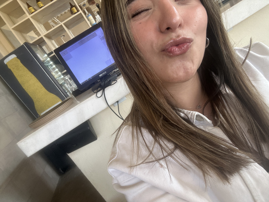 The image depicts a selfie taken within a commercial establishment, likely a bar or restaurant, located in Santiago de Querétaro, Mexico. The frame is dominated by a female individual, positioned in the lower right and center, partially obscuring the background. She has long, light brown hair with highlights, extending over her left shoulder and chest. Her eyes are closed, and her lips are pursed into a "kiss" expression. She wears a light-colored, possibly white, collared garment and a thin silver chain necklace with a small pendant. A silver hoop earring is visible in her right ear. In the background, behind the individual, a white counter extends horizontally. On the counter, a black speaker or electronic device is visible to the left. To the right, a black "NS-TECH" brand monitor, likely a point-of-sale system, displays a blue screen. Behind the counter, a commercial beverage cooler with a glass door is present, featuring a black panel with a yellow, stylized beer glass graphic above it. To the far right, a light-colored wooden shelving unit with multiple square compartments holds various bottles, some appearing to be amber-colored, and clear glassware. The wall behind the shelving is also light in color. The overall environment suggests an indoor commercial setting focused on food and beverage service.
