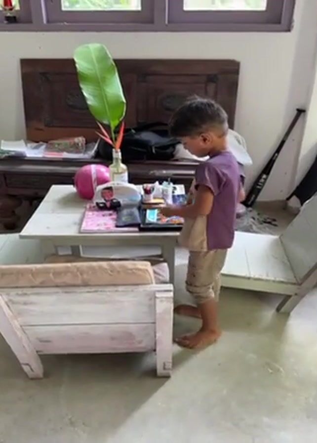 A barefoot young boy, wearing a purple t-shirt and tan pants, stands in a room, looking down at an object in his hands. He has a short haircut and appears to be focused on what he is holding. He leans one leg against a white, distressed-style table. The table is cluttered with various items, including a pink helmet, notebooks, and art supplies. Behind the table is a dark wooden dresser with windows above. A tall green leaf and an orange flower are arranged in a clear glass bottle on the table. To the sides of the table are distressed white chairs with tan cushions. The room has a casual, lived-in feel. A baseball bat leans against the wall in the background.