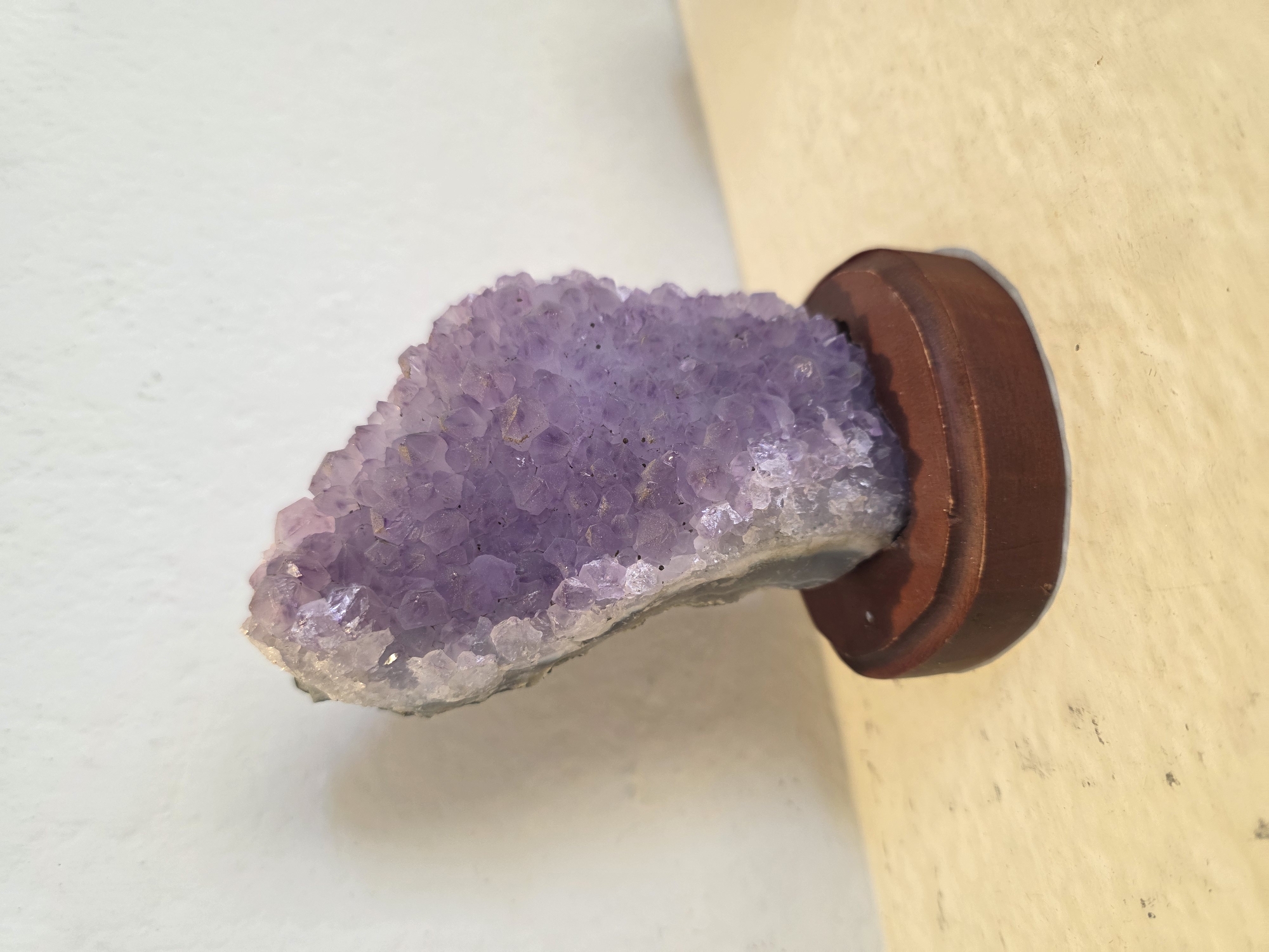 An amethyst geode fragment, approximately 15 cm in height, is positioned on a dark brown, circular wooden base. The amethyst displays numerous small, faceted crystals predominantly in shades of light to medium purple, covering a rough, greyish-white mineral matrix. This object rests on a light beige, subtly textured surface, likely a countertop or shelf. A plain, light off-white, textured wall forms the background. No individuals, actions, or interactions are depicted. The environment is an indoor setting located in the city of Puebla, Mexico.