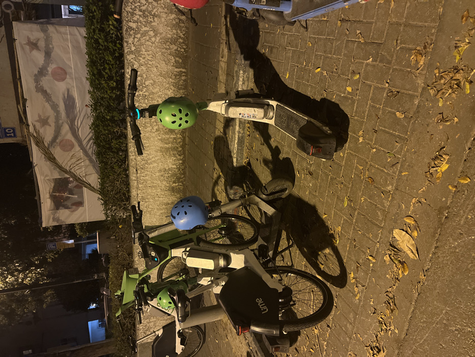 The image presents a nighttime urban scene in Tel Aviv, Israel. Multiple electric shared-mobility vehicles are parked on a brick-paved sidewalk. Two "Lime" electric bicycles are visible; one on the left with a green helmet attached and "Lime" branding on its rear fender, and another further back with a blue helmet. Adjacent to these, two "Lime" electric scooters are present; one centrally positioned with a white frame and a bright green helmet, and another partially visible on the far right. The vehicles cast prominent shadows across the pavement, which is scattered with dry, fallen leaves. Behind the vehicles, a textured, light-colored wall or planter supports green shrubbery. Directly behind the foliage, a temporary white fabric structure, decorated with red circles, stars, and green garland-like elements, consistent with a Sukkah, is visible. A blue street sign displaying the number "10" is affixed to a building in the dark background. No individuals are present in the scene.