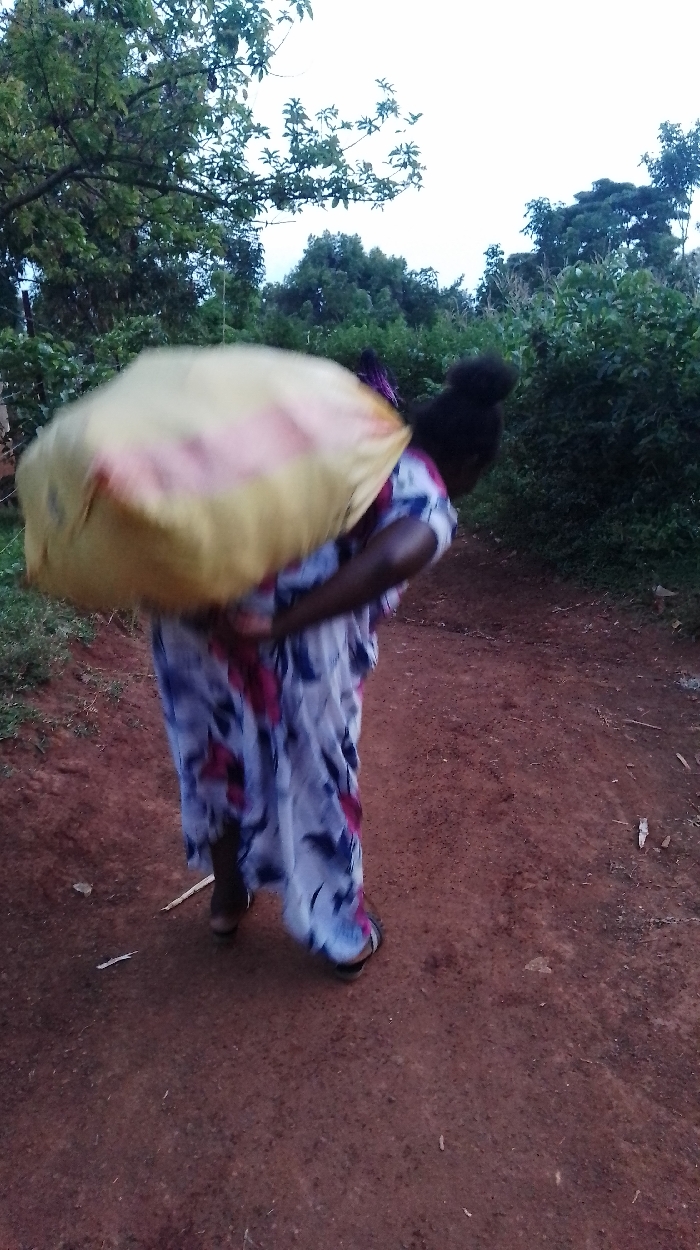A single individual is depicted outdoors in Siaya Township ward, Kenya. The individual, identified as an adult female with dark hair, is shown in motion, walking on a reddish-brown dirt path. She wears a long, loose-fitting dress with a white base and blue/purple and pink floral patterns, and dark sandals. A large, bulging, light yellow sack, appearing to contain various items including some with pink/red coloration, is carried on her back, secured over her shoulders. The individual is leaning forward, indicating the weight or bulk of the load. The environment features dense green foliage, including trees and bushes, lining the path and extending into the background. The sky is light grey. No other individuals or man-made structures are discernible within the frame.