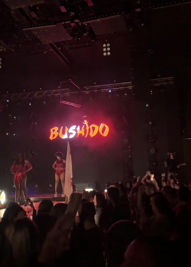 The video captures a lively concert scene. On stage, two performers are visible, dressed in shimmering outfits. A large screen behind them displays the word "BUSHIDO" in glowing letters. A spotlight illuminates the stage as a dense crowd of people cheers and raises their hands, some recording the performance on their phones. A few individuals can be seen waving white flags emblazoned with red text. The venue is dimly lit with several ceiling lights and a stage lighting system. The overall atmosphere is energetic and celebratory.