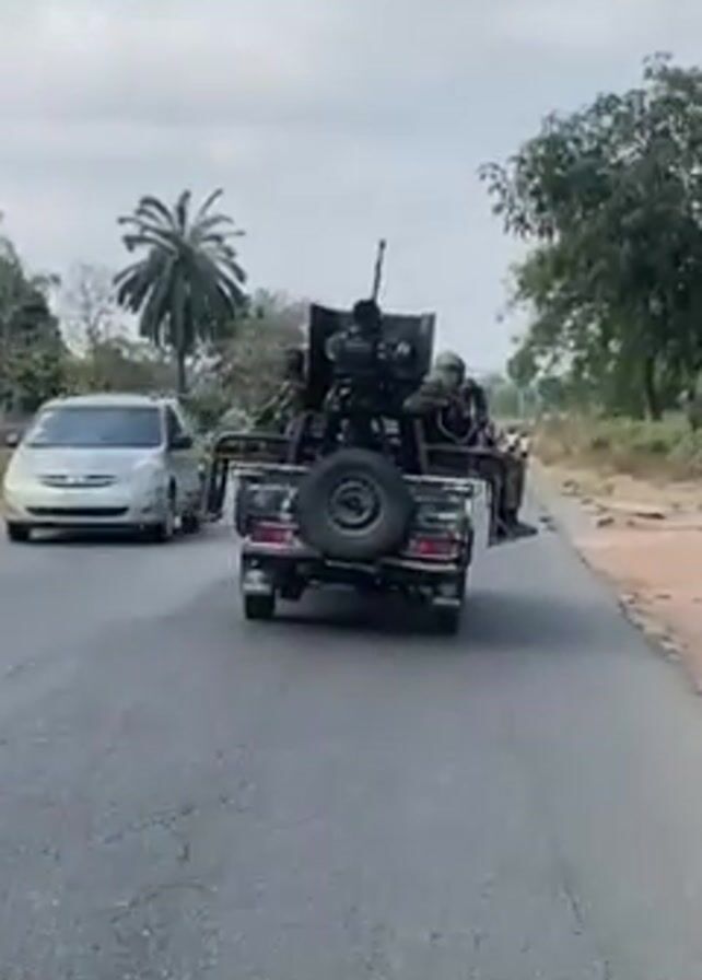 The video depicts a dark-colored pickup truck with a mounted gun driving down a paved road. The truck carries several soldiers. The video is taken from another vehicle, presumably following the truck. The camera occasionally focuses on the camouflage netting covering the helmet of the person filming. The environment consists of roadside vegetation, palm trees, and a few pedestrians. The sky is overcast. The truck with the soldiers continues driving down the road.