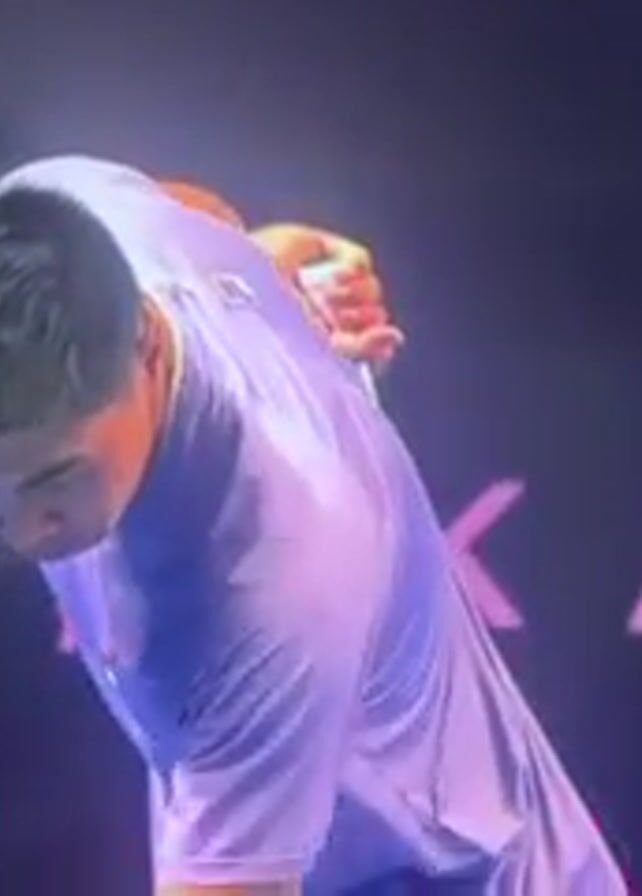A medium shot depicts a man wearing a short-sleeved lilac shirt, looking down and to his left, possibly at a tennis ball. Behind him is a dark background with bright pink text that appears to read "TY, KAZ" and partially visible, a pink circular design. The lighting casts a cool tone on the scene. The man's expression is focused.
