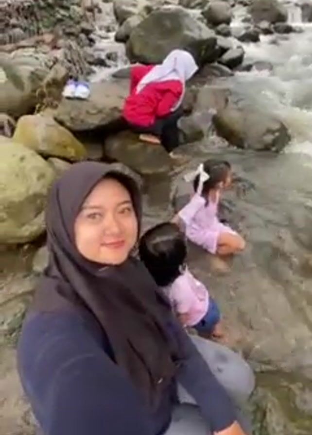 A woman wearing a dark hijab is taking a selfie next to a shallow rocky river