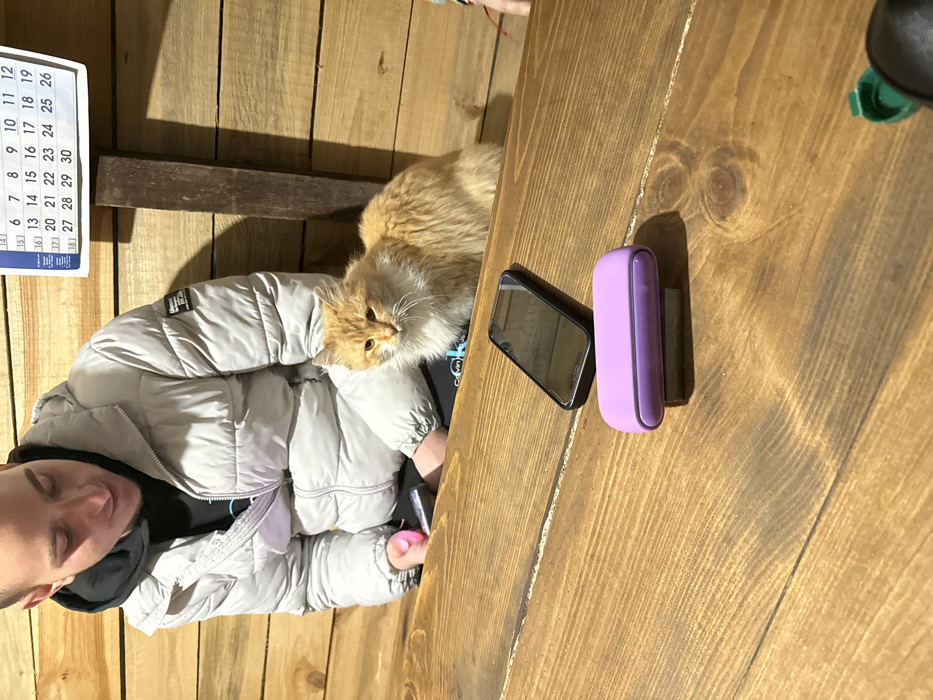 The scene is set indoors in Atiya, Bulgaria. A male individual is seated behind a light brown wooden table, with an orange and white long-haired cat positioned to his right on a surface at a similar height. The man wears a light grey hooded puffer jacket over a black hoodie, looking downwards at a silver object held in his left hand. The cat is observing the area, looking forward. On the wooden table in the foreground, a black smartphone with its screen facing upwards rests diagonally. Adjacent to it is a purple, rounded rectangular electronic device, placed on a small dark rectangular base. The background features a wall constructed from horizontal wooden planks. A white paper calendar, displaying dates from 13 to 30, is affixed to the upper right portion of this wooden wall. A dark vertical wooden beam is visible behind the cat. A green plastic object is partially visible in the extreme lower right corner.