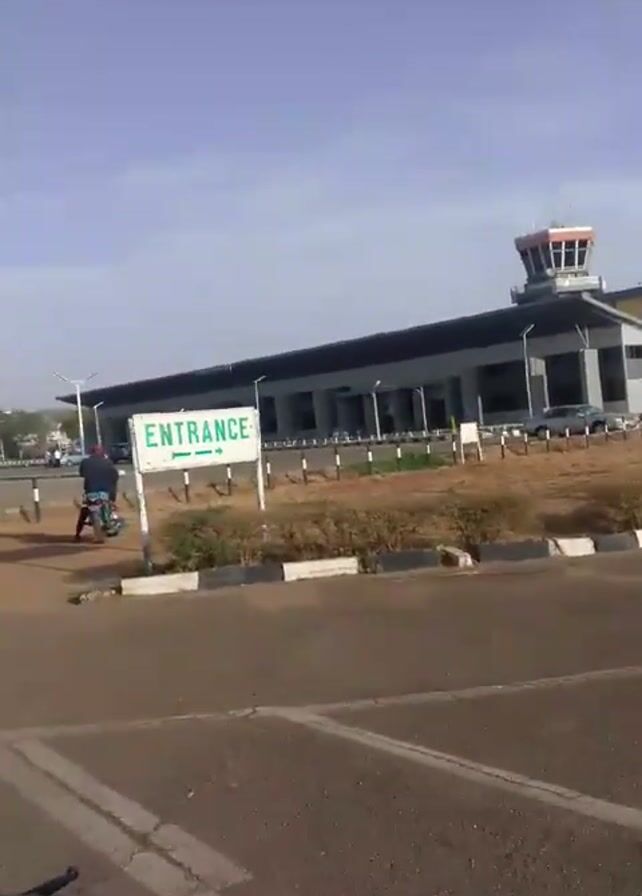 n airport building with an air traffic control tower. In the foreground is a parking lot with white stripes, and a sign indicating the entrance to the airport. A person on a motorcycle can be seen driving past the entrance sign towards the airport building. The sky is blue and the environment appears to be sunny. The ground around the parking lot is covered in brown vegetation.