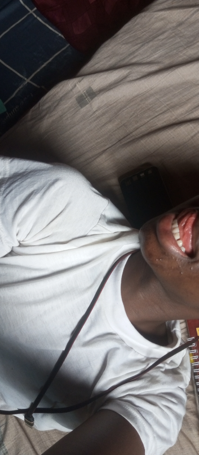 person lying on a bed with a white t-shirt on. Only their face and upper body are visible. They are laughing, displaying their teeth and tongue. Next to them is a cell phone and a notebook. The bed is covered with blue and tan blankets. A cable hangs around their neck.