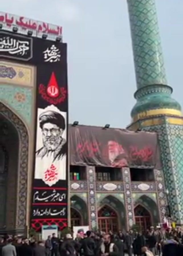 A medium shot shows a large group of people gathered in front of a building with Islamic architectural features. The building has intricate tile work and is adorned with large banners bearing portraits of a man, presumably a religious figure. The banners feature religious text in Arabic, and the Iranian flag is also visible. A tall, teal-colored minaret stands beside the building. In the foreground, there is a fountain, with water jetting upwards. The weather appears overcast. The crowd is dressed in dark clothing, and they are conversing and observing the scene. Some people are taking photos. The overall atmosphere seems somber and respectful.