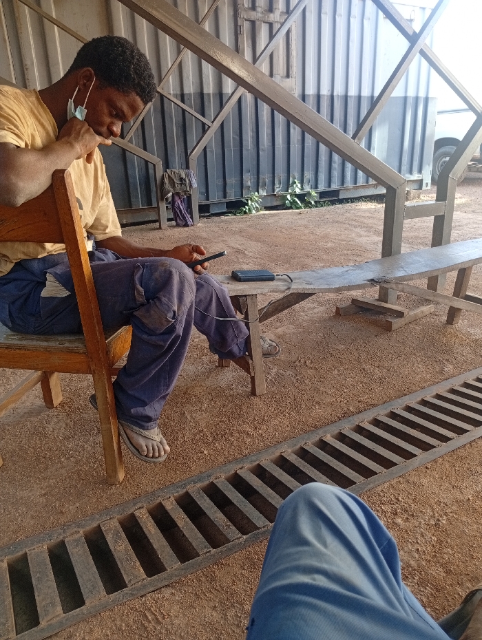 The image depicts a man seated in an outdoor or semi-sheltered area in Jos, Nigeria, focused on a smartphone. The man, of African descent, wears a pale yellow t-shirt, dark blue work trousers, and flip-flops, with a light blue surgical mask hanging from his right ear. He is seated on a light brown wooden chair, with his left hand resting on his chin. On a rustic wooden bench next to him, a black smartphone is held in his right hand, and a dark rectangular power bank is connected by a cable. The ground is reddish-brown dirt. A dark metal drainage grate runs across the foreground, perpendicular to the viewer. In the background, a corrugated metal structure, possibly a shipping container or shed, is visible, painted in two horizontal shades of grey. Overhead, unpainted metal beams form a structural framework. Small green plants grow at the base of the corrugated structure, and a light-colored vehicle is partially visible to the far right. Dark clothing items are hanging on the corrugated wall behind the seated man. The perspective suggests the photograph was taken by an individual whose lower legs, clad in light blue trousers, are visible in the immediate foreground.