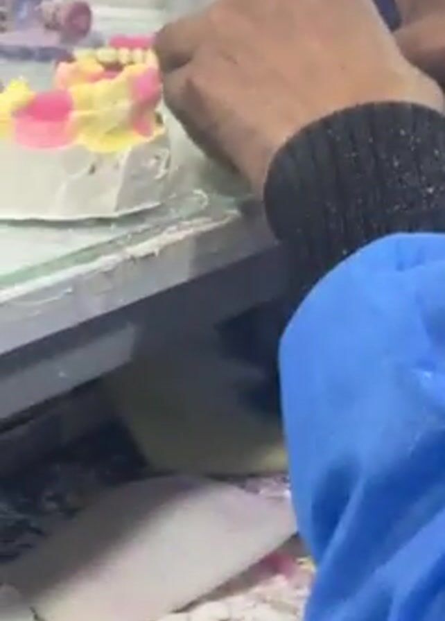 A pair of hands in blue sleeves is using a dental drill to work on a mold of dentures. The mold is plaster and has been colored pink and yellow to represent the gums and teeth. The person is standing at a countertop covered in dental material, including sponges and other plaster cast pieces.