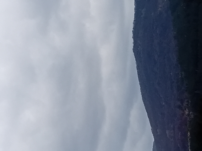 The image depicts an expansive landscape scene, showing a mountain range under a heavily overcast sky, located in the vicinity of Kotel, Bulgaria. The upper approximately two-thirds of the frame are filled with a dense, uniform layer of grey clouds, indicating subdued lighting and an absence of direct sunlight. The lower third of the image is dominated by a dark, forested mountain, presenting a smooth, undulating crest line against the cloudy sky. The vegetation covering the mountain appears to be a dense forest, uniformly dark green or blue-grey in tone. A darker, indistinct band of foliage or ground cover occupies the immediate foreground. No people, animals, specific man-made structures, or discernible actions are present within the frame. The overall environment is natural and appears devoid of immediate human activity.