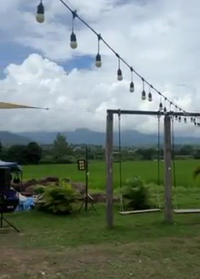 The video pans across a field in front of a mountain range. The sky is cloudy. On the left of the screen, two swings are attached to a wooden frame beneath hanging lights. The camera then pans to the left to reveal a stage set up with an elaborate sound system. The stage has a cover made of brown and cream fabric.