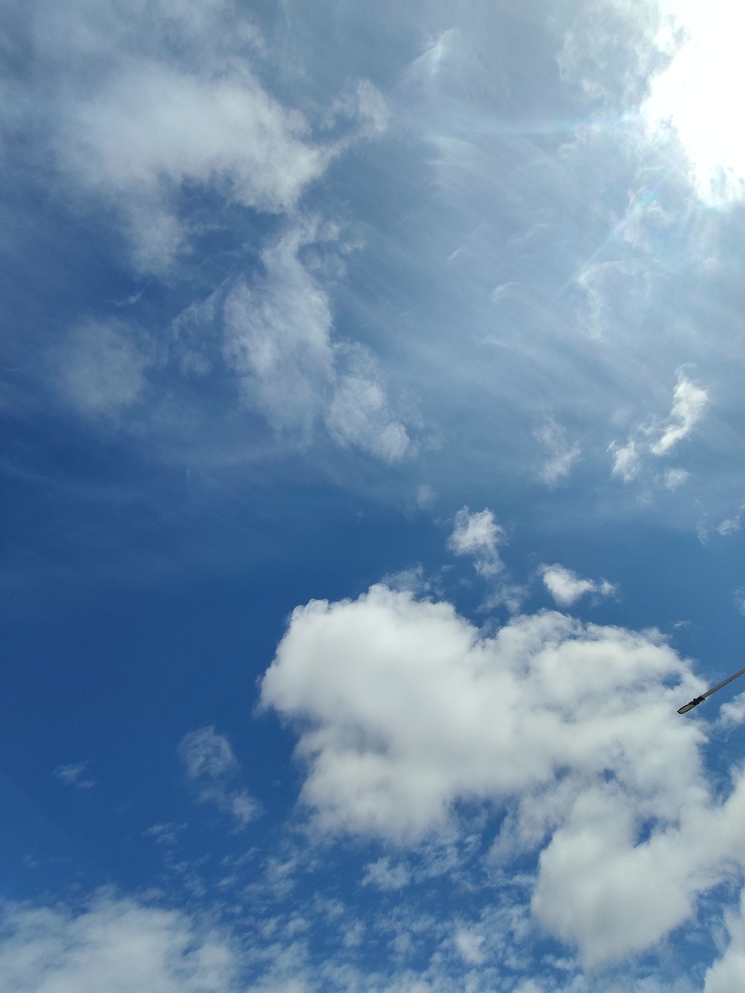 bright blue sky with a variety of white clouds. Some clouds are puffy and dense, while others are thin and wispy. The sun is visible in the upper right corner of the image, and there's an object that looks like a street lamp extending diagonally from the corner on the right side. The location cannot be determined from this image, even with the city specified.