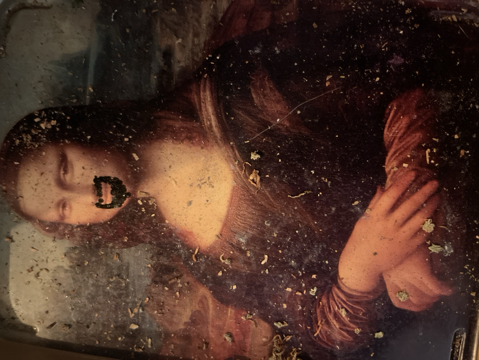 The image displays a close-up of a reproduction of Leonardo da Vinci's Mona Lisa painting, depicted on a flat, reflective surface, possibly a metal tray or a glass panel. A crudely drawn, solid black, U-shaped marking, resembling a beard, is present on the lower face of the Mona Lisa, covering the mouth and chin area. The surface of the reproduction is heavily covered with an array of scattered particulate matter, including light brown, flaky fragments of various sizes; smaller, dark green-brown granular material; and fine dust or fibers. These particles are distributed across the entire visible area, with some concentrations evident around the hands of the Mona Lisa figure and in the upper left portion of the image. The surface exhibits multiple fine scratches and appears soiled. No individuals are present. The immediate environment beyond the object itself is not discernible. The image provides no visual information to ascertain its location within the city of Palma, Spain, or any other specific geographical area.