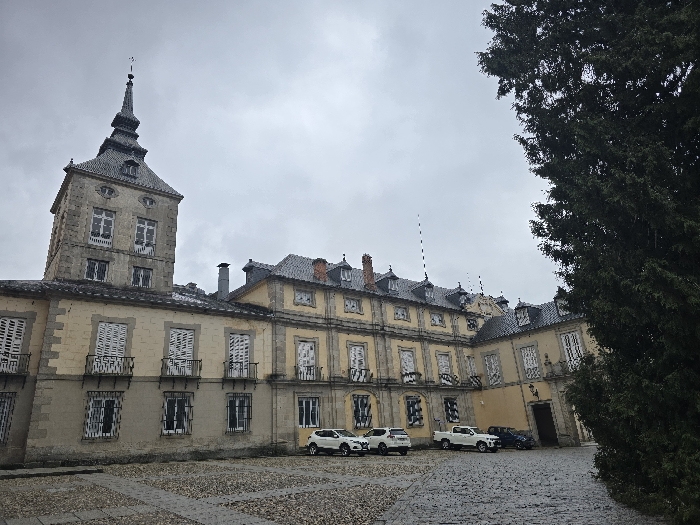This image depicts a section of a grand, multi-story historic building, identified as a portion of the Royal Palace of La Granja de San Ildefonso in San Ildefonso, Spain. The scene is viewed under an overcast, light grey sky. The building's facade is primarily a light yellow, accented by grey stone quoins, window frames, and a grey stone ground level. A prominent four-story grey stone tower with a dark grey conical spire and finial is situated on the left. The structure features numerous windows; many are equipped with closed white louvered shutters, some revealing darker slats underneath. Several second-story windows open onto small, ornate black iron balconies. The roof is a dark grey tiled mansard style, featuring multiple dormer windows and visible chimneys. A large arched entrance is visible on the far right side of the building, set back from the main facade. In the foreground, a cobblestone plaza or courtyard, which appears damp, serves as a parking area. Four modern vehicles are present: two white SUVs, a white pickup truck, and a dark-colored sedan or smaller SUV, all parked facing the building. A large, dark green coniferous tree partially frames the right side of the image, obscuring a section of the building's roofline. No individuals are visible, and no dynamic actions or interactions are occurring within the static composition.
