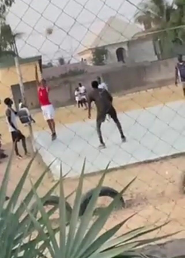 A group of young men are playing volleyball on a concrete court. There is a net dividing the court. Tires are placed around the perimeter of the court, presumably to mark the boundary. Behind the court is a residential area with buildings and trees. The video is taken from behind a chain-link fence and some green leafy plants, creating a slightly obscured view of the action. The men are wearing various casual clothes, and the volleyball is visible in the air as they play.
