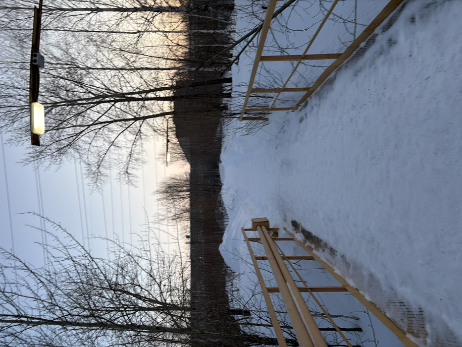 A snowy path stretches into the distance between bare trees. The path, heavily covered in snow, is flanked by a wooden railing on both sides. Overhead power lines intersect the sky. A lit street lamp is positioned on the left. The horizon shows a hint of light, suggesting either sunrise or sunset. The overall scene evokes a sense of quiet winter landscape.