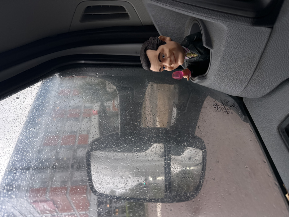 interior of a Ford vehicle, likely a van, viewed from the passenger side on a rainy day. A male bobblehead figure, dressed in a dark suit with a light shirt and striped tie, featuring dark hair and a smiling expression, stands upright within a grey plastic cup holder or storage compartment on the vehicle's dashboard/door panel. The bobblehead holds a translucent pink goblet in its raised right hand. The window adjacent to the bobblehead is heavily obscured by numerous raindrops, indicating active rainfall. Through the rain-splattered glass and past the vehicle's large, reflective side mirror, a blurred multi-story building is visible in the background. This building presents a modern architectural style with a light-colored facade accented by distinct reddish-orange rectangular panels. This structure is identified as the Holiday Inn Express London - Elstree, located at Centennial Avenue, Elstree, Borehamwood, WD6 3FE, within the borough of Hertsmere, United Kingdom. The overall scene is characterized by overcast lighting and wet conditions.