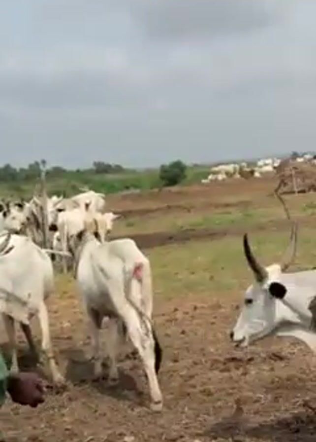 grassy field with a cloudy sky, where a herd of white cattle and a flock of sheep are grazing. A man in a green robe and a patterned cap is seen walking among the cattle, holding a yellow liquid-filled bottle. The camera pans to another man in a striped shirt and a black cap, who is standing in the field and appears to be preparing a syringe with a similar yellow liquid. In the background, there are haystacks and scattered trees.