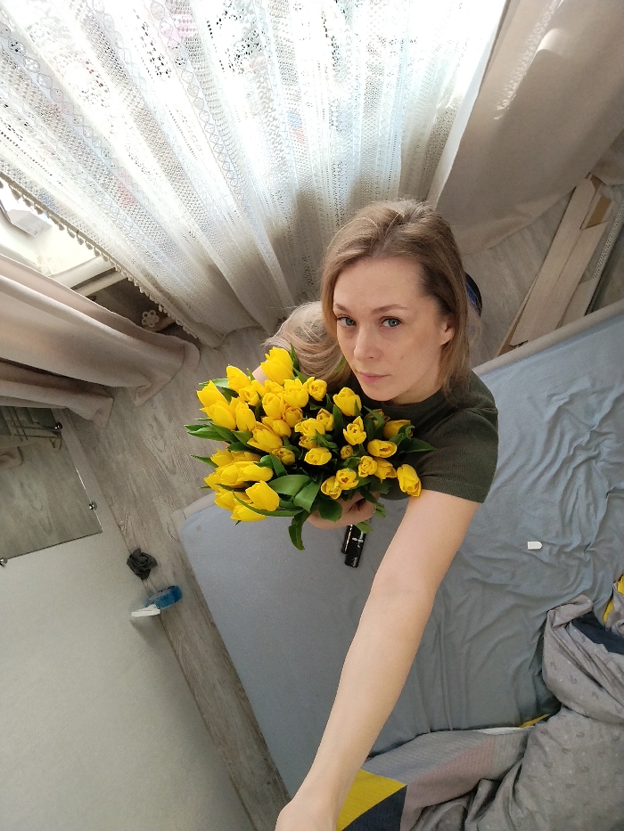 An overhead selfie captured indoors depicts a female subject with blonde hair, wearing a dark olive green short-sleeved top. She holds a large bouquet of approximately thirty to forty yellow tulips with green stems in her left hand, positioned centrally. Her right arm extends downwards, out of the frame, indicating she is holding the camera. The background to the subject's left features a window partially covered by patterned white lace curtains and beige drapes. Below the window, a light wooden floor is visible, along with a reflective rectangular surface, likely a mirror, and small dark and blue/white objects on the floor. To the subject's right, a bed is made with a light grey fitted sheet, and a crumpled duvet or blanket displaying grey and yellow geometric patterns is present. Several light-colored wooden boards or frames lean vertically against the wall in the far right. The image contains no discernible markers to identify a specific location in Izhevsk, Russia.