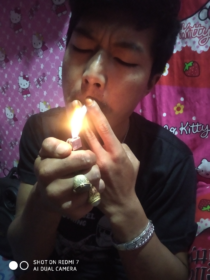 An individual is depicted in a medium close-up, engaged in the act of lighting a white cylindrical object, consistent with a cigarette, using a metallic lighter. The subject, appearing male, is centrally positioned, with their face angled slightly right and eyes closed or heavily squinted due to the bright flame. The left hand operates the lighter, producing a visible flame, while the right hand holds the object to the subject's lips. The left hand displays two ornate rings on the ring and pinky fingers. The right wrist is adorned with a silver-colored, multi-link bracelet. The subject wears a dark short-sleeved garment and a thin necklace. The background features pink-patterned fabric or wallpaper, displaying repeated "Hello Kitty" characters, text, strawberries, and flowers. A dark, indistinct object is partially visible in the lower-left background. The illumination is primarily sourced from the lighter's flame. This scene occurs in Cipinang, Indonesia.