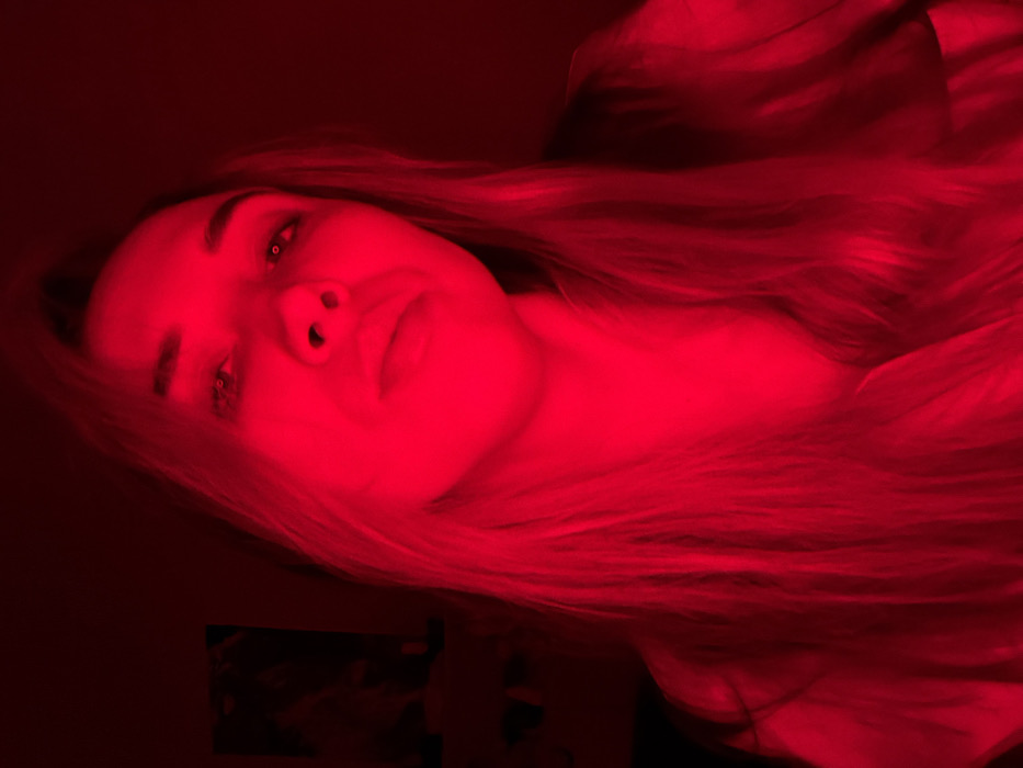 The image displays a young female individual positioned centrally, illuminated by an intense red light source