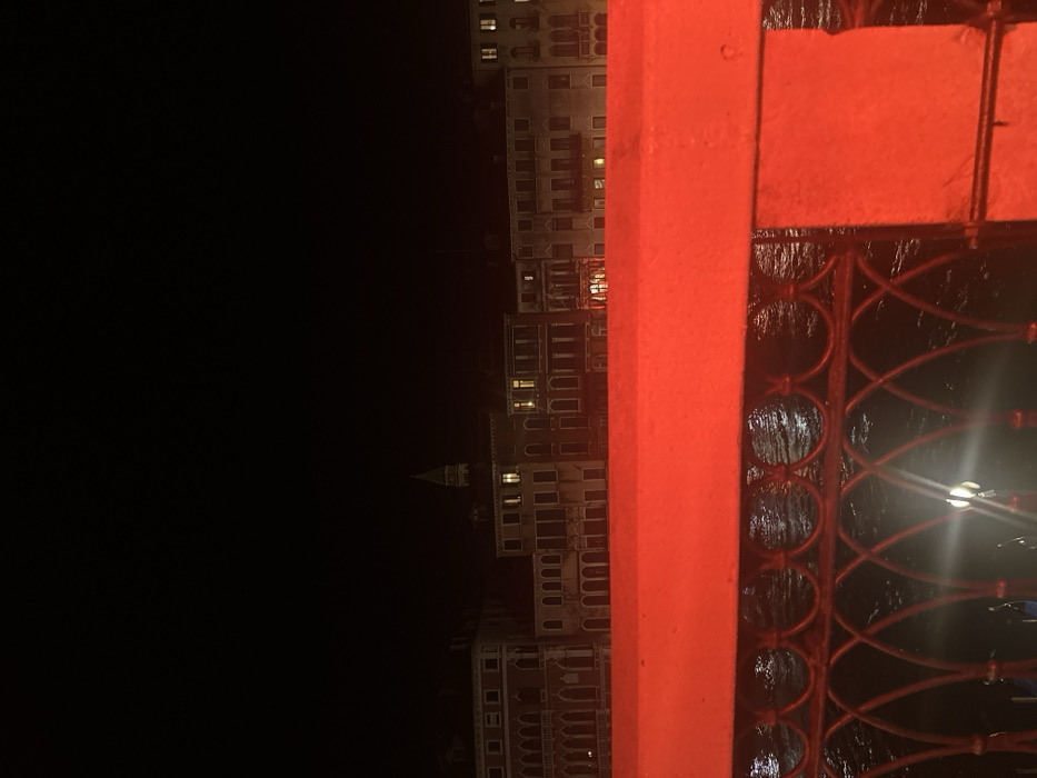 The image depicts a nocturnal scene in Venice, Italy, observed from an elevated position, likely a bridge, overlooking a canal. The foreground is dominated by a broad, horizontal barrier, consistent with a bridge parapet, intensely illuminated in a reddish-orange light. Directly beneath this, a dark, decorative wrought-iron railing with looped patterns is visible. Below the railing, the dark surface of the canal water reflects scattered points of light. In the background, a continuous line of multi-story Venetian buildings, characterized by traditional architecture, stretches horizontally. Numerous windows within these structures emit warm yellow light. A distinct, pointed spire, resembling a campanile, rises above the rooftops of the buildings in the central-left area. The sky above is uniformly dark. No individuals or specific actions are discernible within the frame.