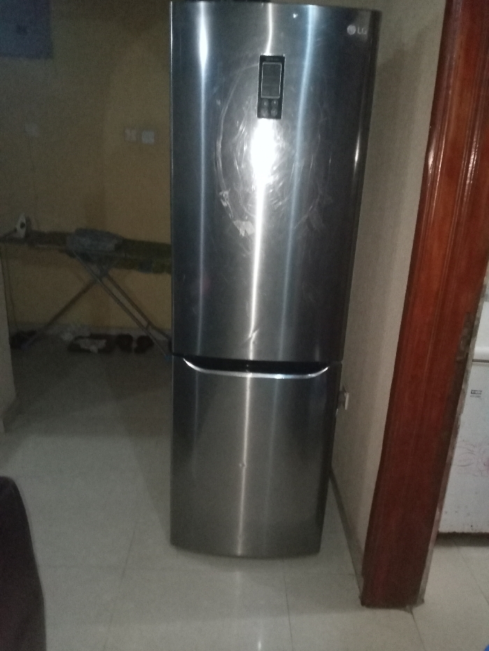 - "An LG stainless steel refrigerator stands next to a dark wooden door frame" by FM-LB6MU2, licensed under CC BY 4.0