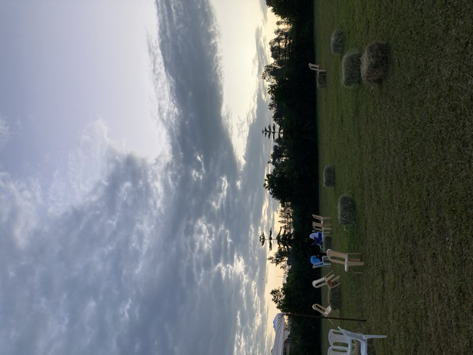 A field is set with hay bales and empty chairs under a cloudy sky at dusk. A line of trees divides the field from the horizon, where a faint orange glow remains. The sky is filled with layers of grey and white clouds. A glimpse of a white tent and additional seating is visible in the lower-left corner.