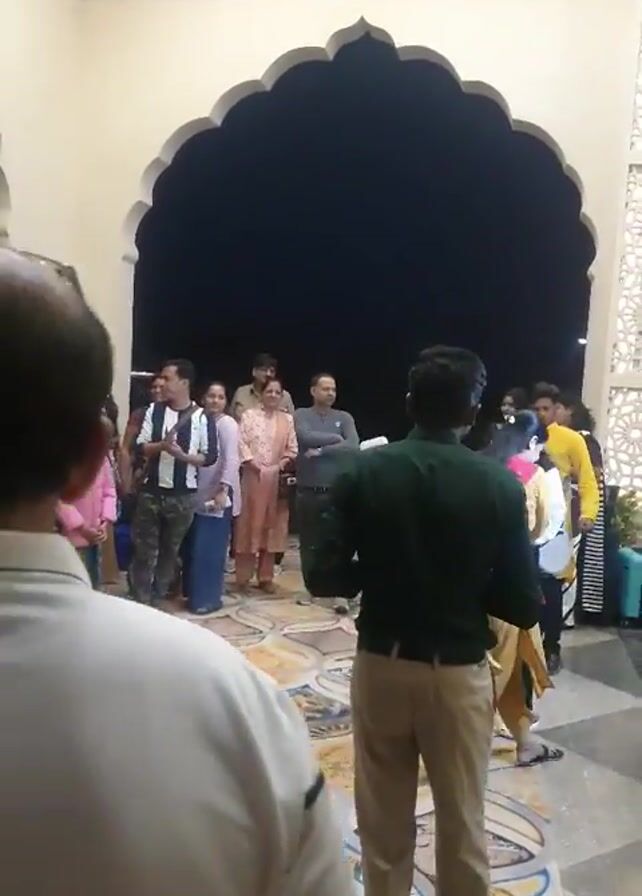group of people gathered in what seems to be a hall or courtyard. They are watching and/or participating in a cultural performance or dance. A girl dressed in a black and white jacket, black pants and white sneakers appears to be dancing. One man is recording on a mobile device, and another man in a green shirt and khaki pants is positioned to the side. Other individuals stand around observing, and some seem to be taking pictures with their phones. The area is well-lit and features decorative flooring with a mosaic pattern. The architecture includes an arched opening, possibly leading to an outdoor space or another room. The overall ambiance suggests a celebratory occasion or event.