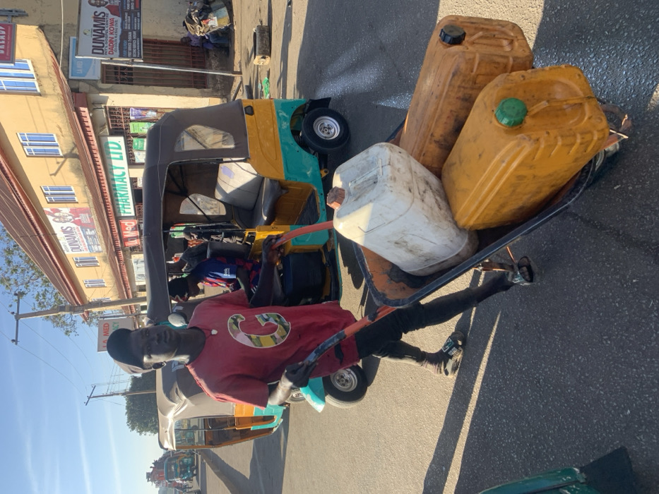 A man in a red shirt and black cap is pulling a wheelbarrow filled with three large plastic containers on a street. The containers are yellow and white, with one having a green cap. A three-wheeled vehicle is parked next to the wheelbarrow. In the background, a building with multiple windows and signs that reads "Pharmacy Ltd" and "Dunamls" is visible. The scene is bright and sunny.