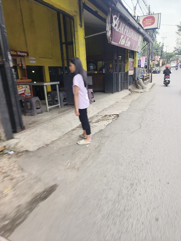The image depicts a street scene in Cimahi, Indonesia. The primary subject is a young female standing on a concrete sidewalk adjacent to an asphalt road, positioned to the right of the frame's center. She has long dark hair, wears a light purple short-sleeved shirt, black pants, and light-colored slip-on shoes. Her body is oriented towards the left, with her head slightly turned towards the road. Behind her are two yellow-painted commercial buildings. The building to the left displays a sign reading "Mie Happy" and has outdoor metal tables with dark plastic stools. The building to the right features a prominent, faded red-brown banner sign with white text, partially reading "SELAK PRASMANAHAN Teh Eva," and a smaller rectangular sign above it displaying "Seblak Prasmanan Teh Eva." Metal security gates are visible at the entrance of this building. The asphalt road, appearing somewhat blurred due to camera motion, extends into the background. Multiple motorcycles are visible on the road, traveling away from the camera. One motorcyclist in the mid-ground wears a dark jacket and a red helmet. Utility poles and overhead wires are present along the street. The sky is overcast. The sidewalk exhibits minor cracks and scattered debris.
