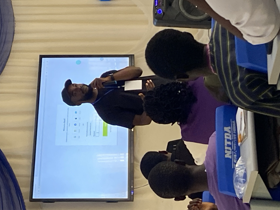 An indoor scene depicts a presentation or lecture taking place in the city of Baganakwo, Nigeria