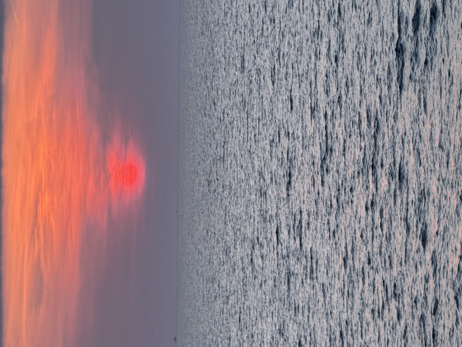 A maritime scene at twilight, either dawn or dusk, is depicted from the vicinity of Alexandroupolis, Greece. A flat horizon line bisects the frame. The upper third of the image is dominated by a large, intensely red, circular sun positioned centrally just above the horizon. The sky immediately surrounding the sun glows with vivid orange-red hues, transitioning upwards into purple-grey and dusky red-orange tones, with subtle, elongated cloud streaks visible across the upper portion of the frame. The lower two-thirds of the image consist of open water, characterized by uniform, closely spaced ripples on its dark grey-blue surface, reflecting faint pinkish hues from the atmospheric conditions. Two small, dark vessel silhouettes are discernible on the distant horizon: one situated to the left of the sun's vertical axis, and a smaller, less distinct one positioned further to the right. No people or specific actions are visible.